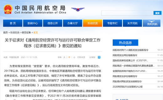 11月(yuè)10日,民(mín)航局運輸司發布通知,就(jiù)《通用航空經營許可與運行許可聯合審定工作(zuò)程序(征求意見稿)》面向行業和社會公開征求意見。