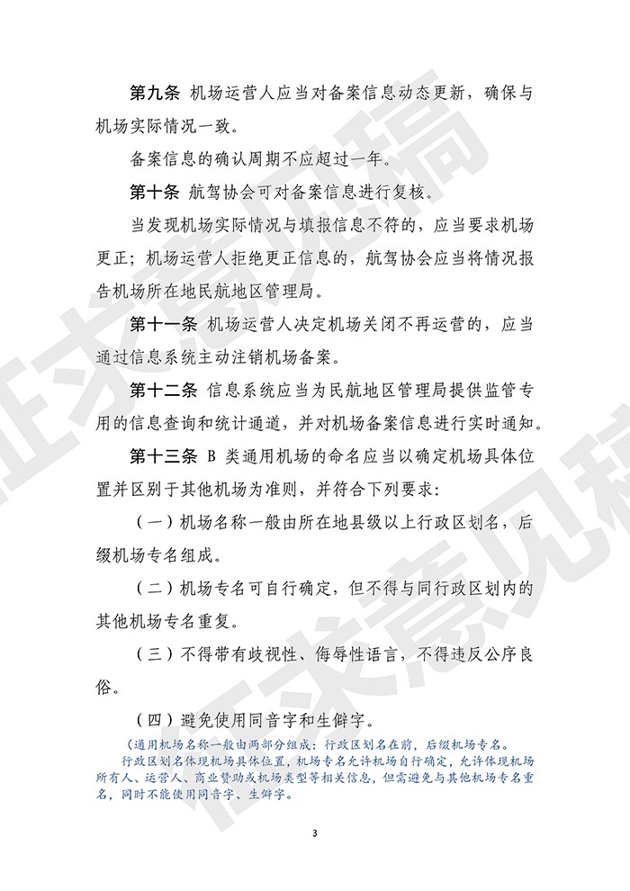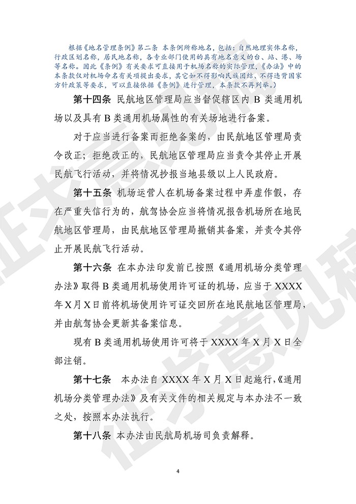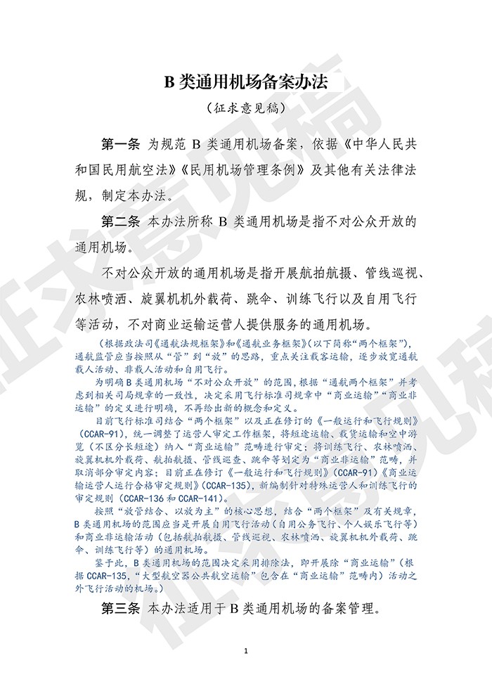 為(wèi)貫徹落實《中華人(rén)民(mín)共和國民(mín)用航空法》 的有關(guān)要求,按照民(mín)航局《關(guān)于通用航空分(fēn)類管理(lǐ)的指導意見》 的指導思想, 規範 B 類通用機場(chǎng)的備案管理(lǐ), 我司組織起草了(le)《B 類通用機場(chǎng)備案辦法》, 并形成了(le)征求意見稿,現(xiàn)向各相關(guān)單位征求意見。