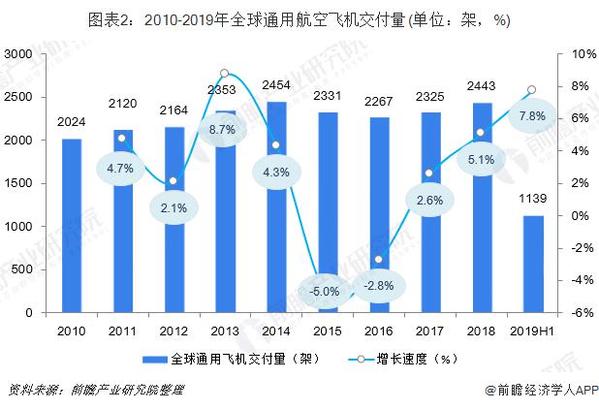 根據美國通用航空制造商(shāng)協會(GAMA)發布的“通用航空統計手冊及産業展望”:《2018年度報(bào)告》,2018年,全球共有通用飛機44.6萬架,與2017年保持一(yī)緻。全球通用航空飛機交付量則延續2017年的增長趨勢,2018年交付量為(wèi)2443架,較2017年增加118架,增長5.08%。2019年上(shàng)半年年,全球通用航空飛機交付量為(wèi)1139架,同比增長7.8%。