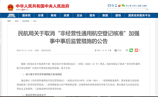 民(mín)航局關(guān)于取消“ 非經營性通用航空登記核準”加強事(shì)中事(shì)後監管措施的公告。